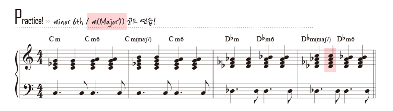 [초판 2쇄] 48쪽 'minor 6th / m(Major7) 코드 연습' 제목, Dbm(maj7) 코드 정정