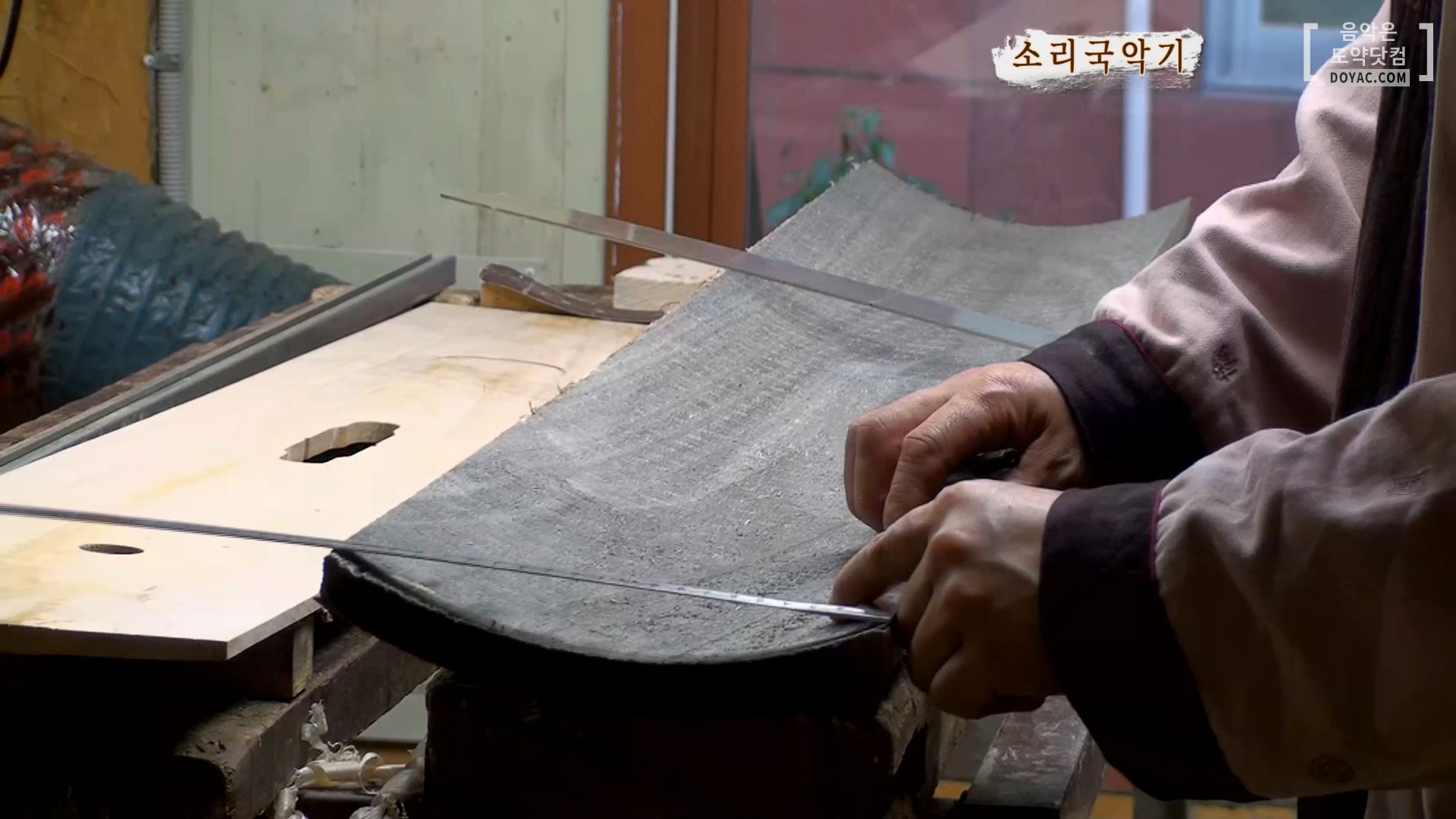 충분히 건조를 시켰다면 이제 가야금 앞판(상판)재단을 시작으로 악기 부위별로 결합을 해줄 텐데요. 앞서 말씀드렸듯이 가야금의 상판은 오동나무, 뒤판은 밤나무로 만듭니다. 정악가야금은 앞판과 뒤판 모두 오동나무를 사용한다는 게 다르죠. 자를 이용해 치수에 맞게 잘라주시고, 상단을 만들기 위해 형틀을 그리고 재단을 해줍니다.