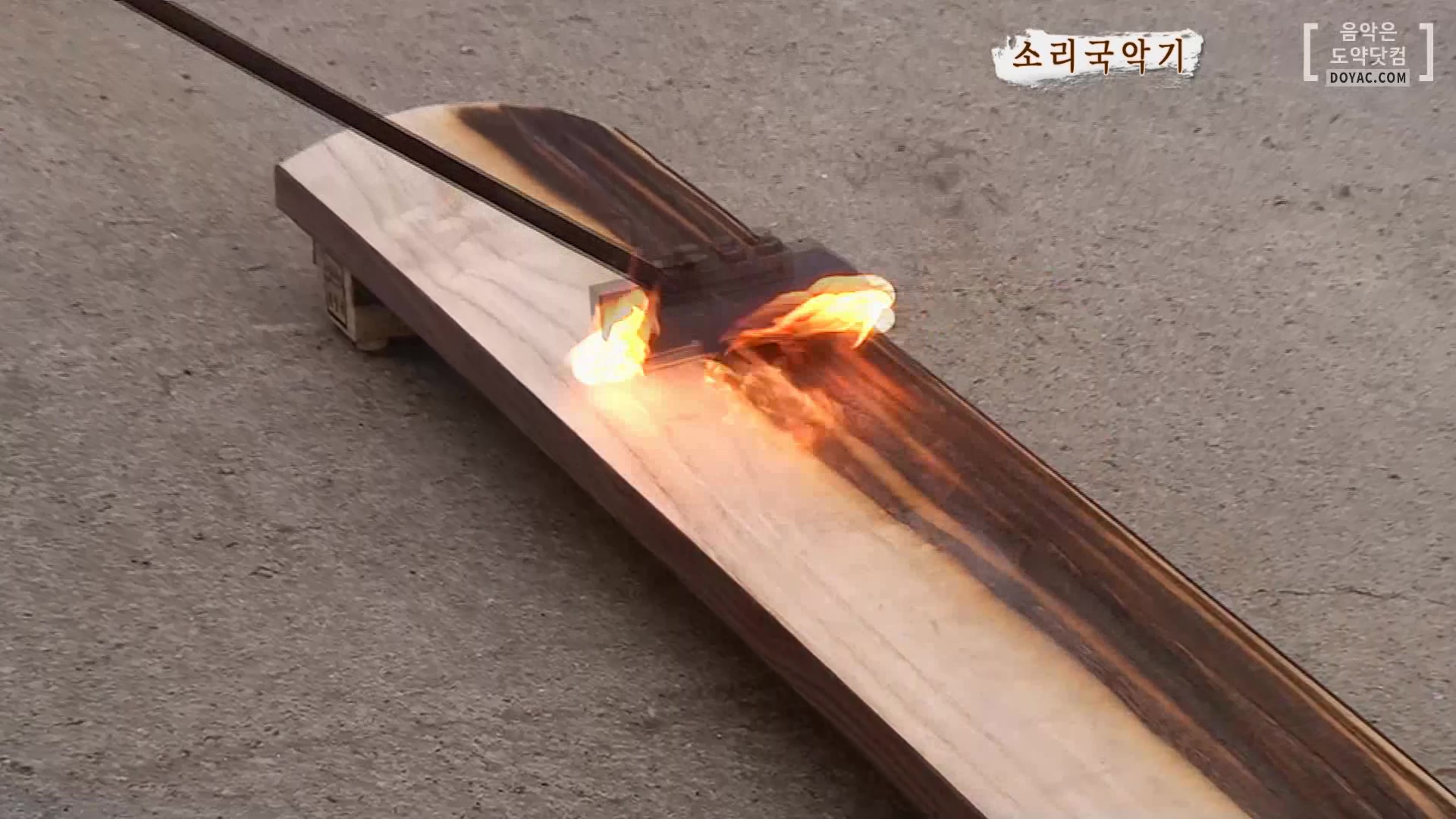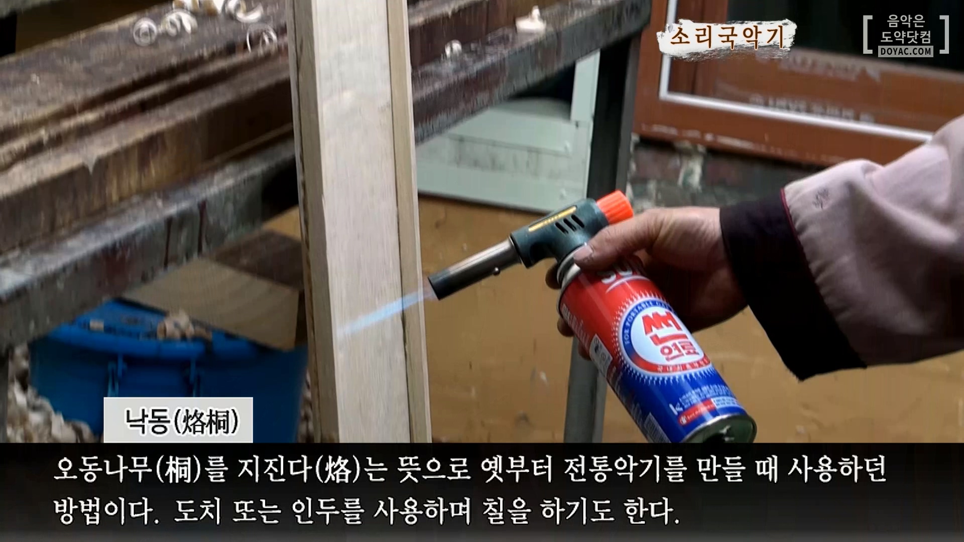 이 과정까지 마무리되면 상판 안쪽과 뒤판을 1차로 가열해 줍니다. 나무를 가열하는 이 과정을 #낙동 이라고 하는데요. 예부터 전통악기를 만들 때 사용하던 방법입니다. 낙동의 방법으로는 도치, 인두, 칠. 3가지가 있죠. 가야금에 낙동하는 이유는 오동나무의 진을 뽑아내어 습기를 피하고 좀이나 벌레를 먹는 것을 방지하기 위함입니다. 또한 나무를 그을리면 수명이 오래가죠.