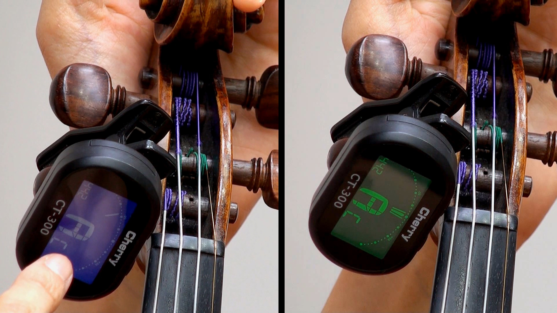 이 튜너는 바이올린의 줄의 진동을 느껴서 음정을 체크하는 기계인데요. 전원을 켜주시고 바이올린 팩에 꽂아서 음을 맞추면 됩니다. 가장 기본이 되는 음, [라(A)] 음인 두 번째 줄을 먼저 맞춰보겠습니다. 두 번째 줄을 튕겨보세요.