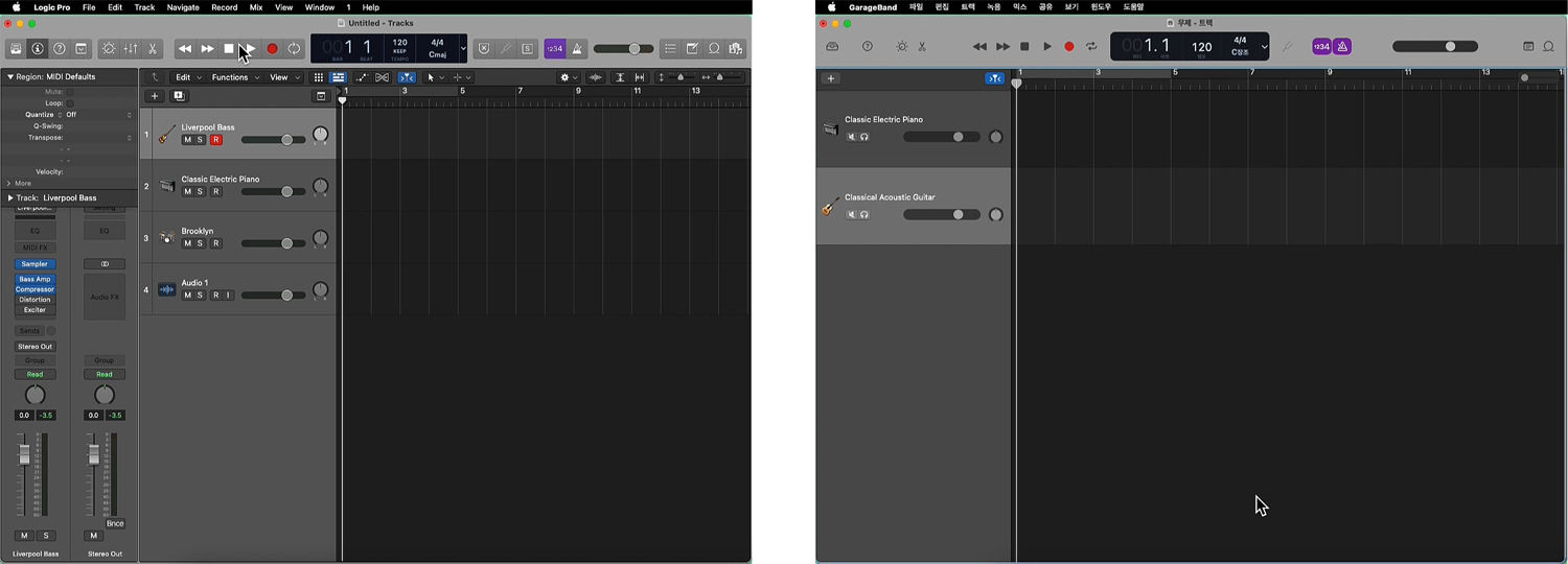 < 좌 - 로직 프로 X, 우 - 개러지밴드>