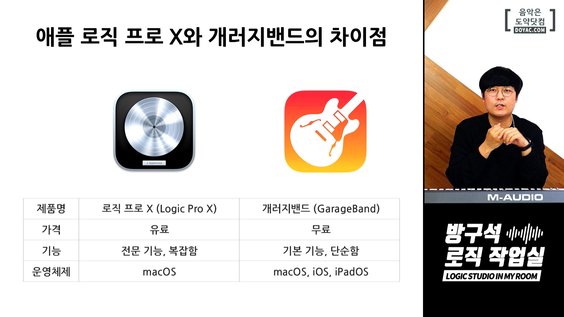 이번 시간에는 #로직 프로 X(Logic Pro X)와 #개러지밴드(GarageBand)를 비교해보도록 할 텐데요, 로직과 개러지밴드 모두 #애플(Apple)에서 제작한 음악제작 소프트웨어입니다. 그런데 동일한 성능의 소프트웨어를 굳이 두 개나 만들 필요는 없겠죠? 로직과 개러지밴드의 차이점과 어떤 분들에게 어떤 제품이 더 맞는지에 대해 속 시원하게 알려드리도록 하겠습니다.