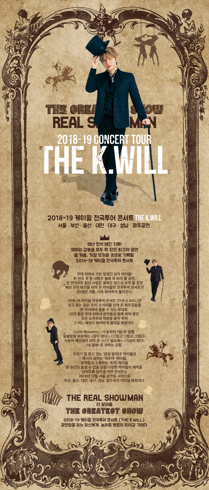 우리가 잘 알고 있는 #감성발라더 케이윌과, 에너지 넘치는 #퍼포머 케이윌, 관객들과 소통하는 #토커 케이윌, 단 한 순간도 놓칠 수 없을 만큼 다양한 케이윌의 매력을 넘치도록 담아낼 이번 콘서트는 2018년 12월 서울 공연을 시작으로 부산, 울산, 대전, 대구, 광주까지 이어질 예정입니다. 'The Real Show Man'이 보여줄 'The Greatest Show' 케이윌 전국투어 콘서트 [The K.WILL] 공연장을 찾는 당신에게 놀라운 행운이 찾아갈 것입니다.