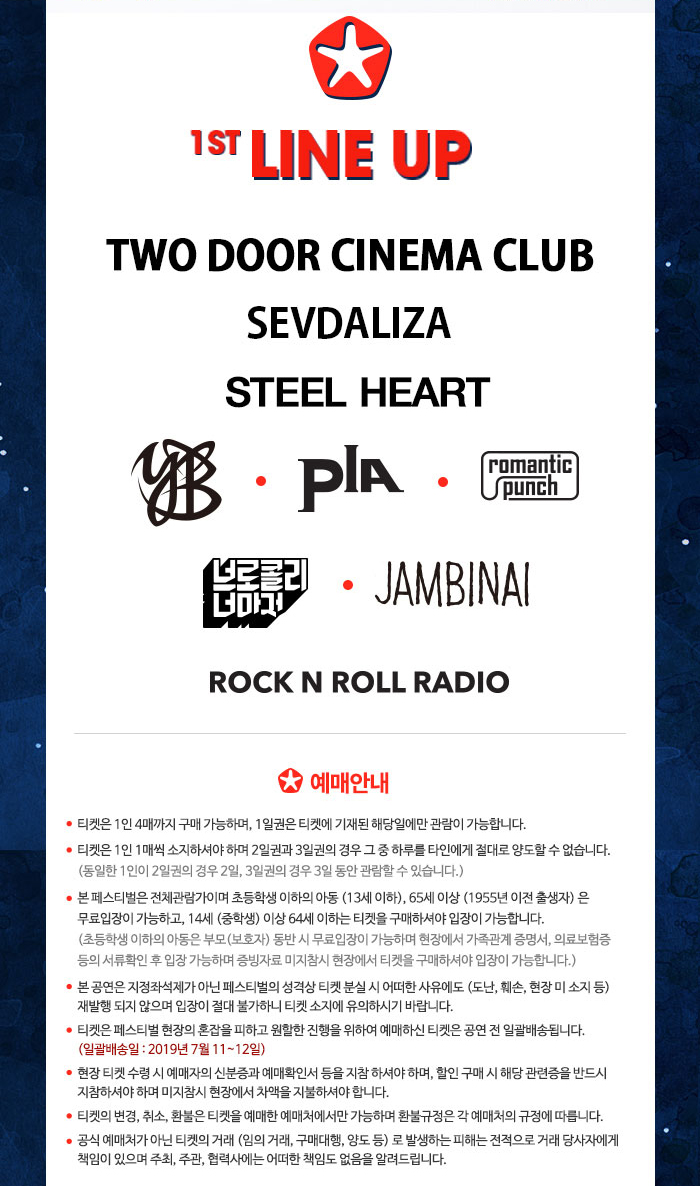 먼저 1차로 국내·외 출연진 9팀을 공개했는데요. 해외 아티스트로는 #she's gone으로 세계적으로 유명한 미국의 헤비메탈밴드 #스틸하트(STEEL HEART), 북아일랜드 출신의 인디밴드 #투도어시네마클럽(Two Door Cinema Club), 작년 3월 첫 내한공연을 가지고 다시 찾아온 #세브달리자(Sevdaliza)가 한국 팬들을 만난다고 합니다. 또한, 국내 아티스트로는 아쉽지만 올해를 끝으로 해체한다고 밝혔던 밴드 #피아, 그리고 우리의 귀를 즐겁게 해주고 흥을 넘치게해줄 #YB와 그외에 #브로콜리너마저, #잠비나이, #로큰롤라디오 등이 출연해 페스티벌 매니아들의 여름을 락의 열기로 뜨겁게 달굴 예정이라고 합니다. 아직 발표되지 않은 2,3차 라인업은 추후에 발표한다고 하니, 얼마나 더 다양한 아티스트들이 함께할 지 궁금해지네요 :D