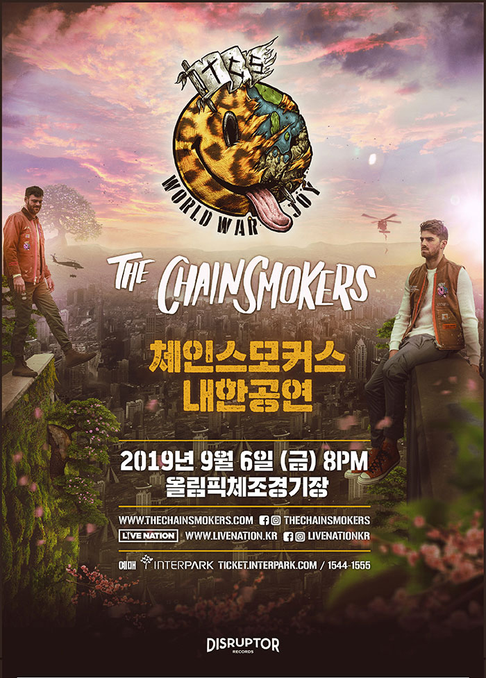 [콘서트] The Chainsmokers Live in Seoul - World War Joy 체인스모커스 내한공연 : 2019.09.06 세계적으로 큰 사랑을 받고 있는 #EDM 듀오! #체인스모커스(The Chainsmokers)가 오는 9월 6일, 단독 #내한공연으로 다시 한국의 팬들을 찾을 예정입니다. 이번 공연은 World War Joy #월드투어의 일환으로 #올림픽체조경기장에서 열린다고 하는데요. 이번 공연 또한 매진을 기록하며 뜨거운 반응을 얻은 지난 공연 때처럼 팬들을 위한 무대들로 가득 채웠다고 합니다 :D