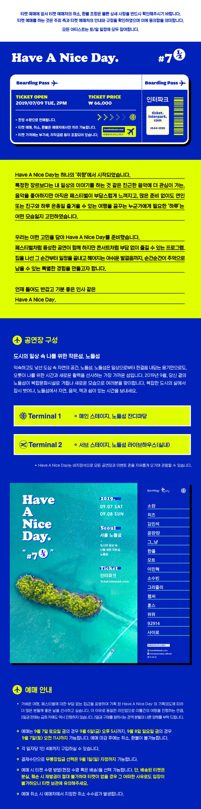 먼저 알고계시면 좋은 사실! #Have A Nice Day #7 1/2 페스티벌은 다른 페스티벌과는 달리 양일간 동일한 라인업으로 진행이됩니다. 공개된 라인업으로는 우리의 귀를 즐겁게 해주고 흥을 넘치게해줄 실력파 밴드 #소란, 플레이리스트에서 빼놓을 수 없는 가수 #치즈, #김민석 그리고 두터운 마니아층의 사랑을 받고있는 #윤딴딴, #모트, #그리즐리, #위위 이외에도 감성보컬 #소수빈, #그_냥, #이민혁, #사이로 등 많은 사랑을 받고 있는 아티스트들이 이름을 올렸습니다.