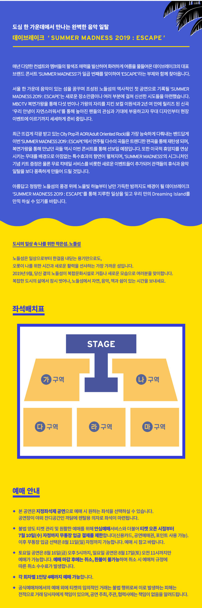 아름답고 청량한 노들섬의 풍경 위에 노을빛 하늘부터 낭만 가득한 밤까지도 배경이 될 데이브레이크 ‘SUMMER MADNESS 2019 : ESCAPE’를 통해 지루한 일상에서 일탈 하실 수 있기를 바랍니다. :D