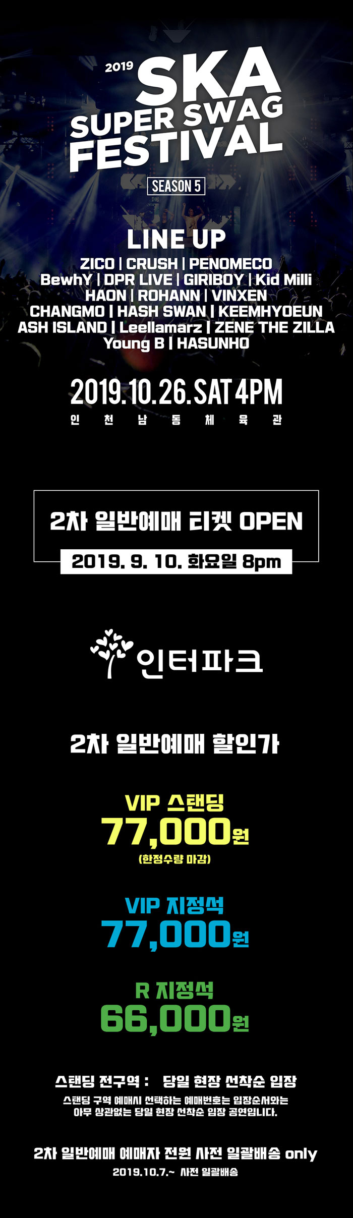 지난 5년간 매 시즌마다 힙합 매니아층의 많은 사랑을 받으며 국내 최고 #힙합페스티벌 중 하나로 인정 받은 #스카슈퍼스웩페스티벌이 공연의 스케일을 키워서 다시 돌아왔습니다. 이번 공연은 시즌5를 맞아 초대형 힙합 페스티벌로 꾸며봤다고 하는데요. 매년 내로라하는 힙합 아티스트들로 채워진 라인업을 선보였던 페스티벌은 이번에도 빵빵한 라인업과 함께 10월 26일(토), 인천 #남동체육관에서 개최된다고 합니다. 남다른 스케일을 뽐내는 이번 페스티벌! 힙합을 사랑하는 분들이라면 달려갈 수 밖에 없겠네요 :D