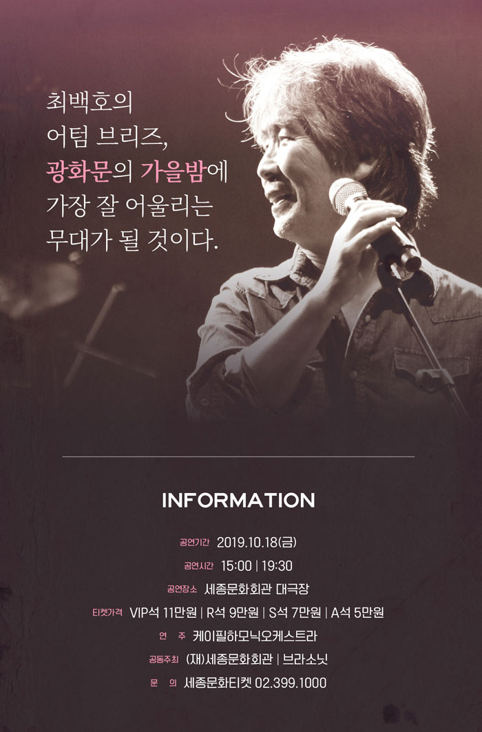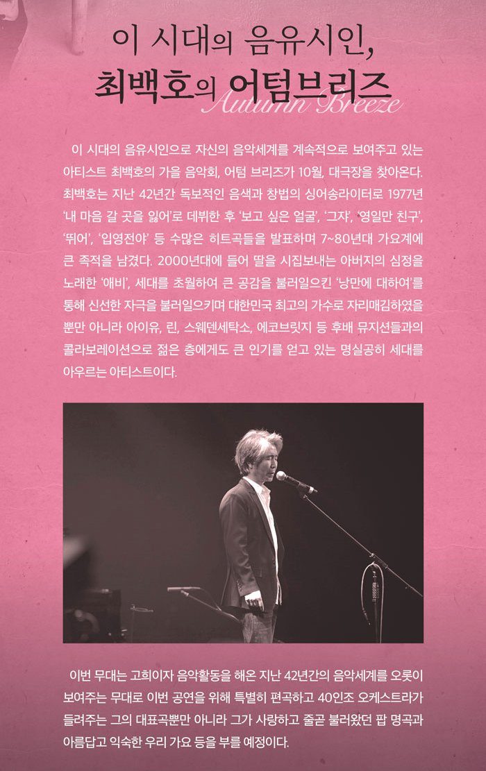 자신의 음악세계를 계속적으로 보여주고 있는 아티스트 #최백호의 가을 음악회, #어텀브리즈가 오는 10월 18일 하루! 여러분의 가을감성을 자극시킬 무대들로 찾아온다고 합니다. 이번 무대는 고희이자 음악활동을 해온 지난 40년간의 음악세계를 오롯이 보여주는 무대로, 이번 공연을 위해 특별히 편곡하고 40인조 오케스트라가 들려주는 그의 대표곡뿐만 아니라 그가 사랑하고 줄곧 불러왔던 팝 명곡과 아름답고 익숙한 우리 가요 등을 부를 예정이라고 하는데요. #세종문화회관 #대극장에서 다양한 곡으로 만나 볼 수 있는 최백호의 무대, 벌써부터 기대가 됩니다 :)
