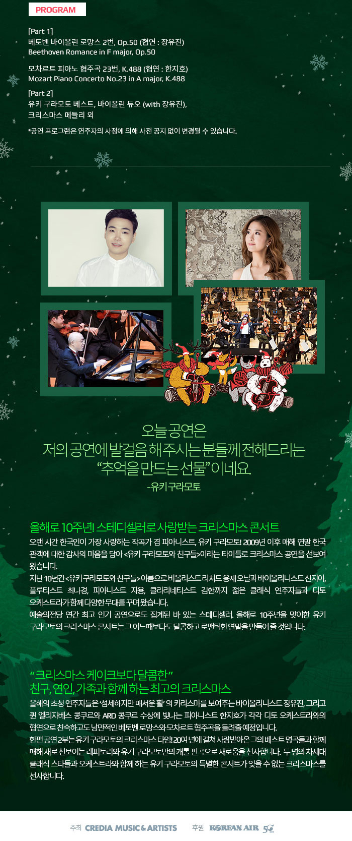 유키 구라모토는 이번 공연에서 그만의 스타일로 편곡된 크리스마스 캐롤과 우리 귀에 친숙한 클래식 명곡, 그리고 20여 년에 걸쳐 사랑 받아온 베스트 명곡들을 들려줄 예정이라고 합니다. 특히 올해의 초청자들은 '섬세하지만 매서운 활'의 카리스마를 보여주는 바이올리니스트 #장유진과 퀸 엘리자베스 콩쿠르와 ARD 콩쿠르 수상에 빛나는 피아니스트 #한지호가 참여해 디토 오케스트라와의 협연으로 낭만적인 베토벤 로망스와 모차르트 협주곡을 들려줄 예정이라고 합니다. 유키 구라모토의 멋진 피아노 연주에 오케스트라 클래식 연주자들인 '친구들'이 함께 만드는 음악, 어느 때보다도 달콤하고 로맨틱한 연말을 만들어 줄 것같네요 :D