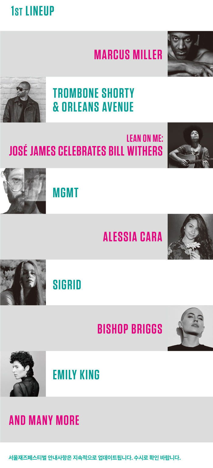 이번 #서재페 #1차라인업 으로는 마커스 밀러, 트롬본 쇼티 & 올리언스 에비뉴, 호세 제임스, 엠지엠티(MGMT), 알레시아 카라, 시그리드, 비숍 브릭스, 에밀리 킹 이렇게 8팀이 발표되었습니다!