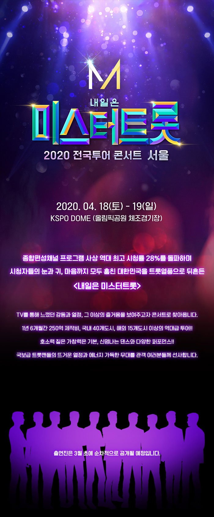 종합편성채널 프로그램 사상 역대 최고 시청률 30%를 돌파하며 시청자들의 눈과 귀, 마음까지 모두 훔친, 대한민국을 트롯열풍으로 뒤흔든 #내일은 #미스터트롯! 지상파와 종편을 모두 통틀어서 9년만에 시청률 30%를 기록했다는 사실! 이렇게 우리에게 트롯열풍을 가져온 미스터트롯이 TV를 통해 느꼈던 감동과 열정, 그 이상의 즐거움을 보여주고자 콘서트로 찾아옵니다. 1년 6개월간 250억 제작비, 국내 40개도시, 해외 15개도시 이상의 역대급 투어! 호소력 짙은 가창력은 기본, 신명나는 댄스와 다양한 퍼포먼스! 국보급 트롯맨들의 뜨거운 열정과 에너지 가득한 무대를 관객 여러분들께 선사합니다.