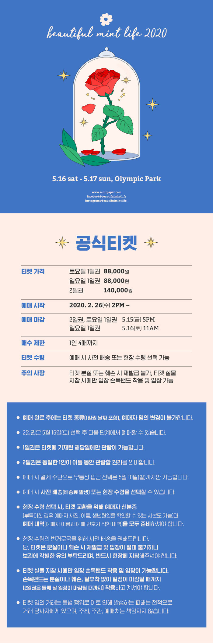 대한민국 최고의 봄 음악 페스티벌 중 하나로 자리잡아 매년 성황리에 개최되고 있는 #뷰티풀민트라이프 #뷰민라 #뮤직페스티벌 을 여러분께 소개해 드립니다! 다른 정보 하나도 없이 개최 날짜와 장소만 공개했는데, 뷰민라라는 이름만 믿고 이번에도 어김없이 오픈과 동시에 매진을 기록한 뷰민라 2020을 확인해 보겠습니다.