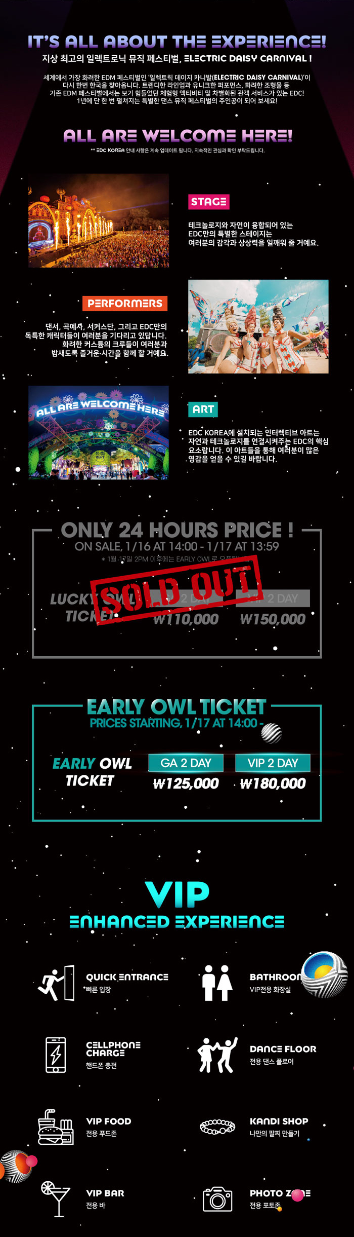 PERFORMERS(퍼포머스) : 댄서, 곡예사, 서커스단, 그리고 EDC만의 독특한 캐릭터들이 여러분을 기다리고 있답니다. 화려한 커스튬의 크루들이 여러분과 밤새도록 즐거운 시간을 함께할 거예요.