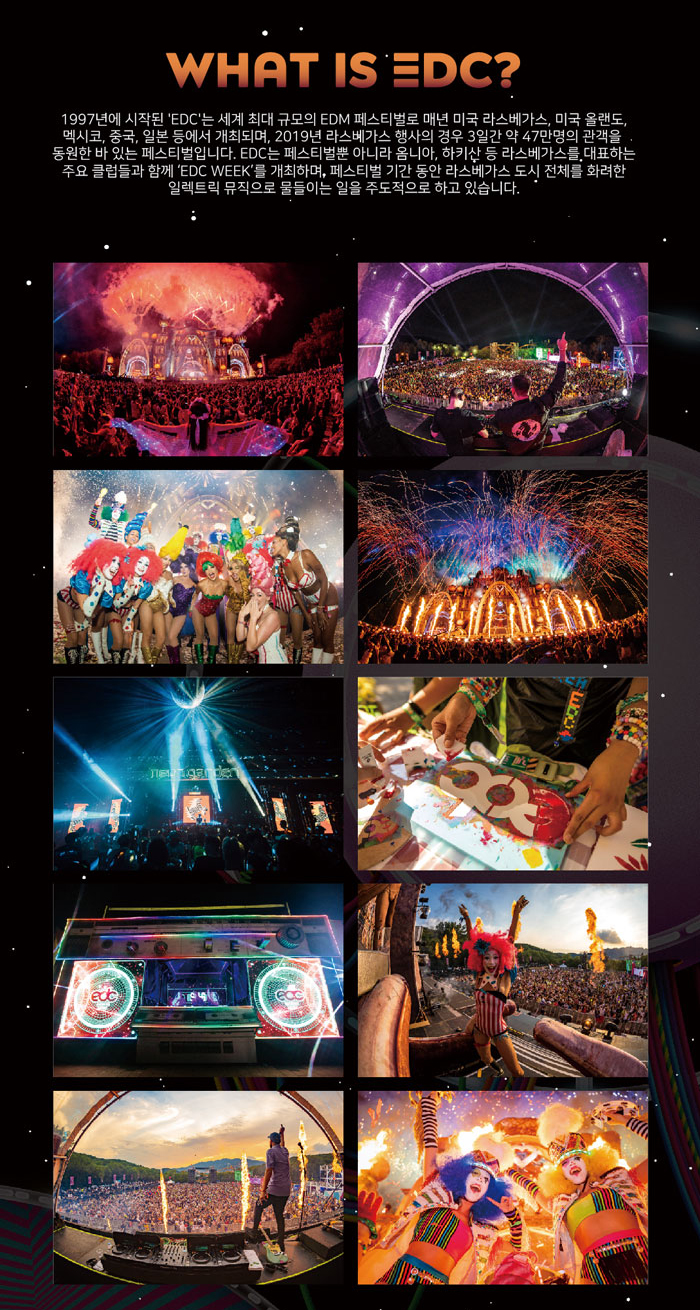 1997년에 시작된 'EDC'는 세계 최대 규모의 EDM 페스티벌로 매년 미국 라스베가스, 미국 올랜도, 멕시코, 중국, 일본 등에서 개최되며, 2019년 라스베가스 행사의 경우 3일간 약 47만명의 관객을 동원한 바 있는 페스티벌입니다. EDC는 페스티벌뿐 아니라 옴미나, 하키산 등 라스베가스를 대표하는 주요 클럽들과 함께 'EDC WEEK'를 개최하며, 페스티벌 기간 동안 라스베가스 도시 전체를 화려한 일렉트릭 뮤직으로 물들이는 일을 주도적으로 하고 있습니다.