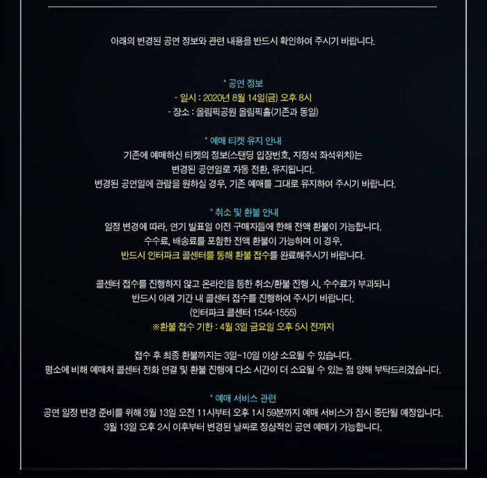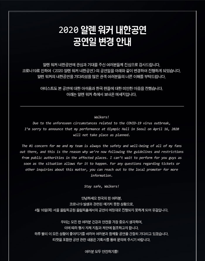 코로나19 발생과 관련하여 예기치 못한 상황으로 4월에서 8월로 공연이 연기되었지만, 모두 건강 유의하시고 8월에 알렌 워커의 내한공연 함께 즐기면 좋겠습니다. :D