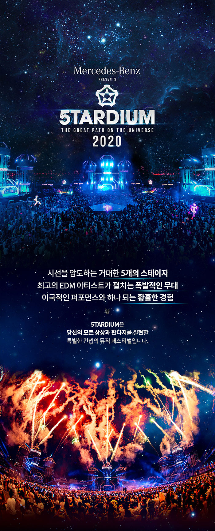 그럼 당신의 모든 상상과 판타지를 실현할 특별한 컨셉의 뮤직 페스티벌인 5TARDIUM에서 최고의 EDM 아티스트가 펼치는 폭발적인 무대와 이국적인 퍼포먼스로 하나되는 황홀한 경험을 느껴보세요!