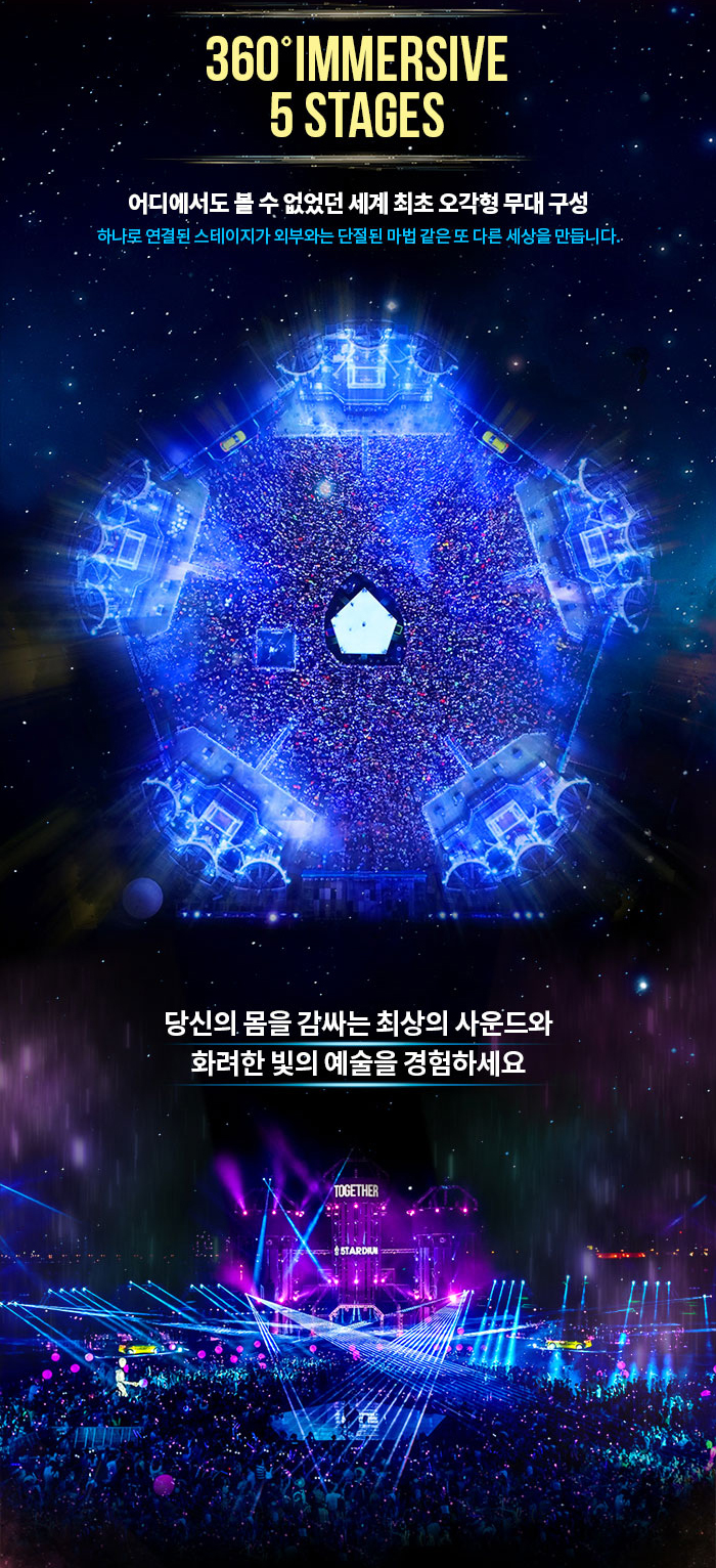 5TARDIUM은 페스티벌 이름에 걸맞게 어디에서도 볼 수 없었던 세계 최초 오각형 무대 구성로 구성됩니다. 하나로 연결된 스테이지가 외부와 단절된 마법 같은 또 다른 세상을 만듭니다. 당신의 몸을 감싸는 최상의 사운드와 화려한 빛의 예술을 경험하세요.