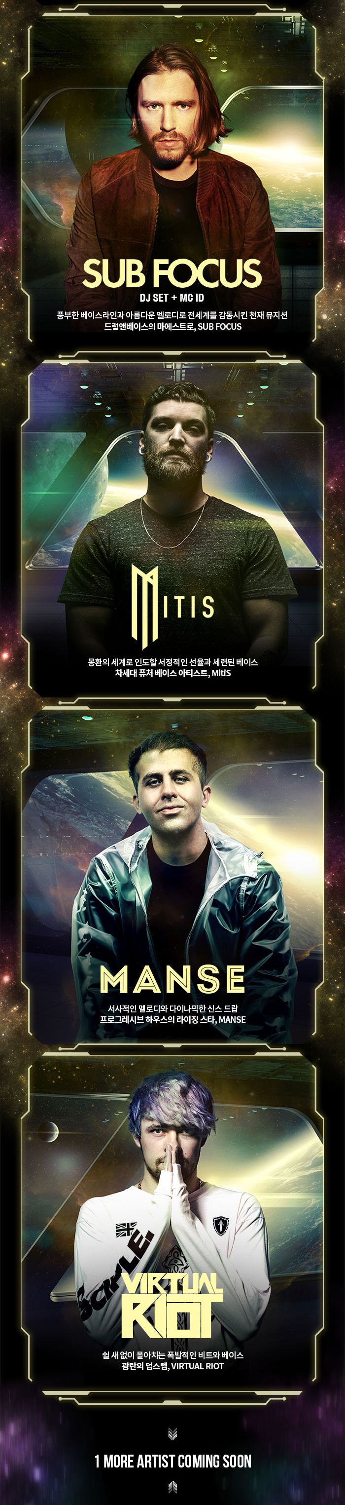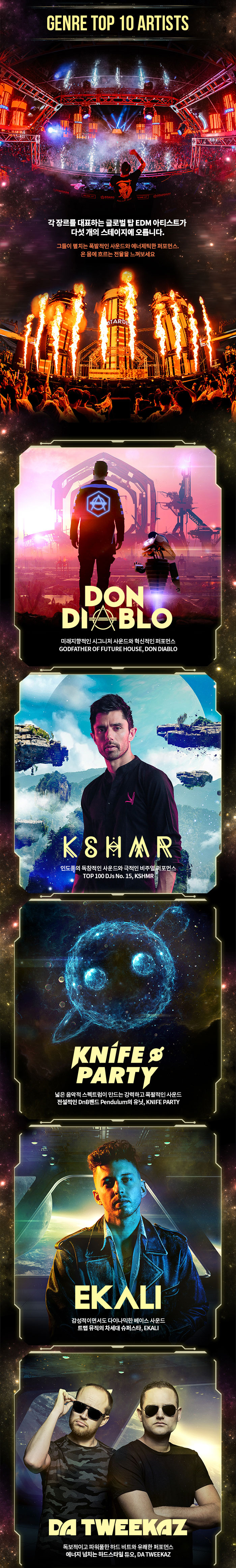 미래지향적인 시그니처 사운드와 혁신적인 퍼포먼스를 선보이는 Future House 장르의 대부인 #Don Diablo , 인도풍의 독창적인 사운드와 극적인 비주얼 퍼포먼스의 소유자 #KSHMR , 넓은 음악적 스펙트럼이 만드는 강력하고 폭발적인 사운드를 가진 전설적인 DnB밴드 Pendulum의 유닛의 #Knife Party , 감성적이면서도 다이나믹한 베이스 사운드로 트랩 뮤직의 차세대 슈퍼스타인 #EKALI , 독보적이고 파워풀한 하드 비트와 유쾌한 퍼포먼스를 보여주는 에너지 넘치는 하드스타일 듀오 #Da Tweekaz , 풍부한 베이스라인과 아름다운 멜로디로 전세계를 감동시킨 천재 뮤지션으로 드럼앤베이스의 마에스트로 #Sub Focus 를 비롯해 #MitiS , #Manse , #Virtual Riot 등이 출연합니다!