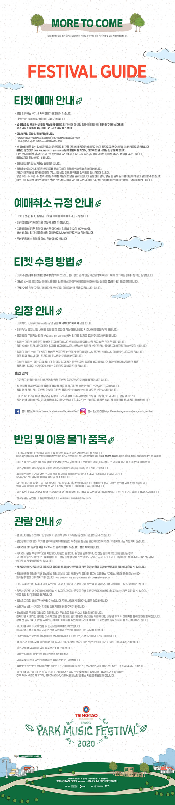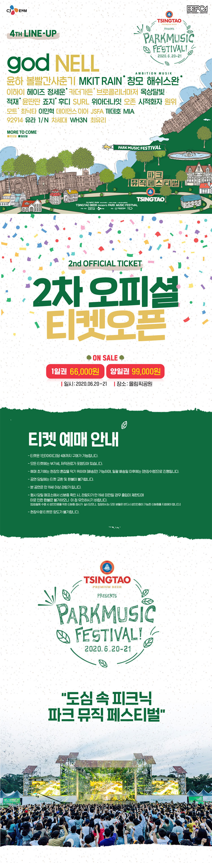 오늘도 어김없이 여러분께 신규 공연 소식을 전해드리기 위해 돌아왔습니다! 이번에 전해드릴 공연은 #2020 #파크뮤직페스티벌 #PARKMUSIC #FESTIVAL 입니다. 파크 뮤직 페스티벌은 3년에 걸쳐 맥주 회사들과 함께 하고 있는데요, 올해도 역시나 칭따오라는 맥주회사와 함께하면서 만 19세 이상만 관람 가능한 공연이라고 합니다. :D