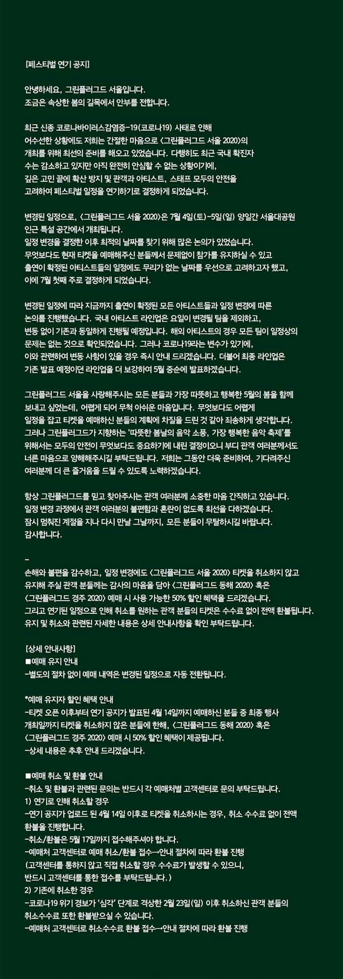 ‘더 나은 내일을 위한 착한 생각과 작은 실천’을 모토로 출발하여 대한민국의 봄을 대표하게 된 친환경 캠페인 뮤직 페스티벌, #그린플러그드서울 #GREENPLUGED #SEOUL 이 아직 조금은 쌀쌀한 이른 봄이지만, 조금은 조심스럽게 개최 소식을 전해왔습니다! 주변의 여러 상황으로 몸도 마음도 위축되는 요즘, 많은 분이 마음 졸이고 계실 거로 생각됩니다. 그래도 지금껏 해왔듯 각자의 자리에서 마음을 다한다면, 언제 그랬냐는 듯 따뜻한 봄날이 우리를 찾아오겠죠?! 곧 우리를 찾아올 따뜻한 봄날의 소식이 여러분께 조금이나마 위로와 응원이 되길 바라며 그린플러그드 서울 2020 공연 소식을 전해드립니다! :D