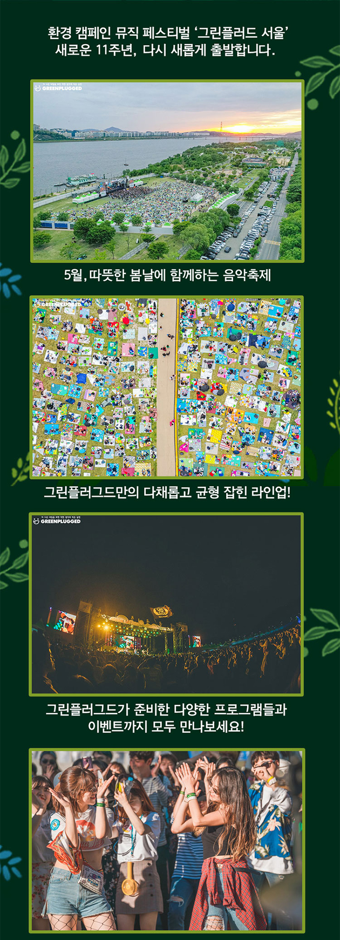'그린플러그드 서울'은 어떻게 모두가 환경과 어우러져 아름답게 살 수 있을지에 대한 고민으로부터 출발한 페스티벌입니다. 착한 생각과 작은 실천을 통해 2010년부터 지속되어 온 이 페스티벌은 이제 많은 분이 기다리고 또 찾아주시는 봄을 대표하는 환경 캠페인 뮤직 페스티벌로 굳건히 자리 잡았습니다!