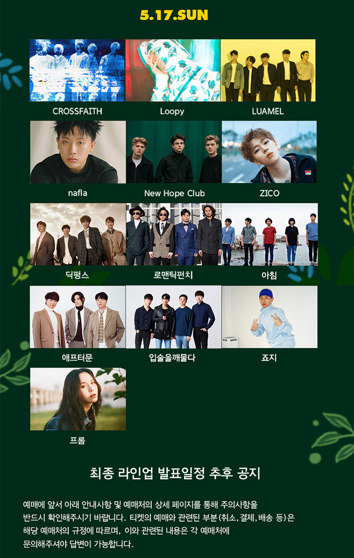 그리고 일요일 라인업으로는 'ZICO(지코), 딕펑스, CROSSFAITH, Loopy, LUAMEL, nafla, New Hope Club, 로맨틱펀치, 아침, 애프터문, 입술을깨물다, 죠지, 프롬'이 확정지었습니다.