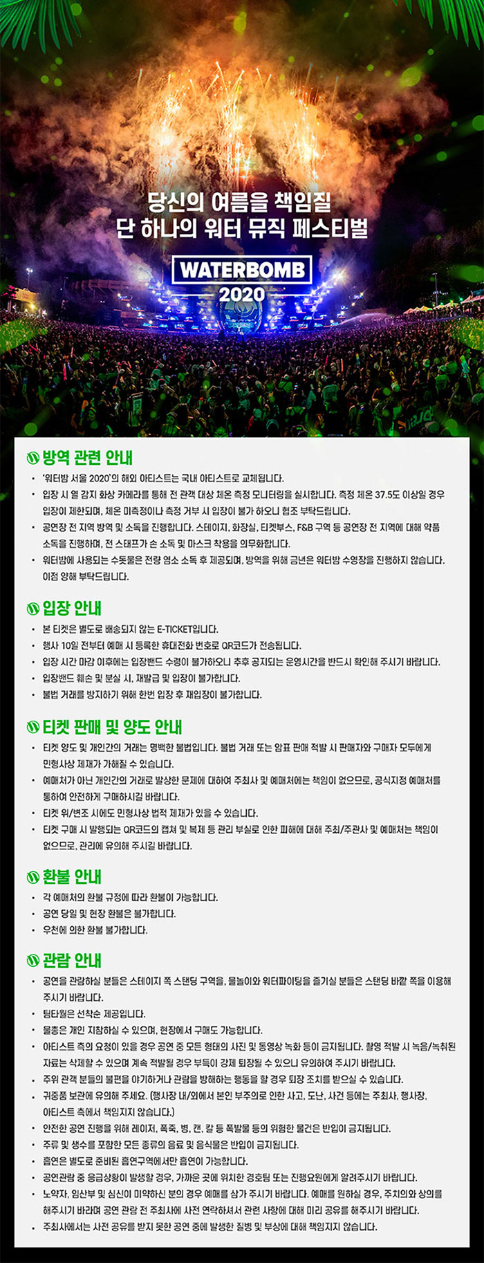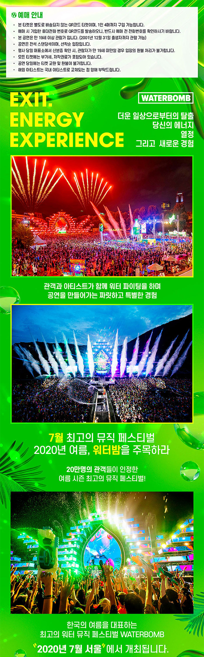 #EXIT 더운 일상으로부터의 탈출, #ENERGY 당신의 에너지와 열정, #EXPERIENCE 그리고 새로운 경험! 7월 최고의 뮤직 페스티벌 2020년 여름, #워터밤 #WATERBOMB 을 주목하세요! 20만명의 관객들이 인정한 여름 최고의 뮤직 페스티벌입니다. 관객과 아티스트가 함께 워터 파이팅을 하며 공연을 만들어가는 짜릿하고 특별한 경험을 하실 수 있습니다.