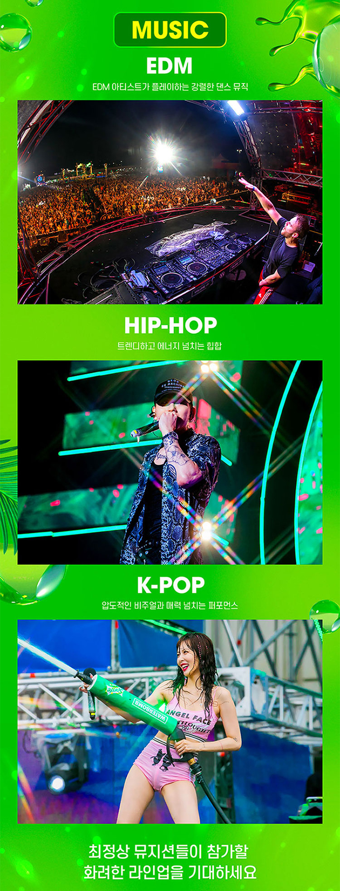 EDM 아티스트가 플레이하는 강렬한 댄스 뮤직, 트렌디하고 에너지 넘치는 힙합, 압도적인 비주얼과 매력 넘치는 퍼포먼스를 선보이는 K-POP 등 최정상 뮤지션들이 참가할 화려한 라인업을 기대하세요!