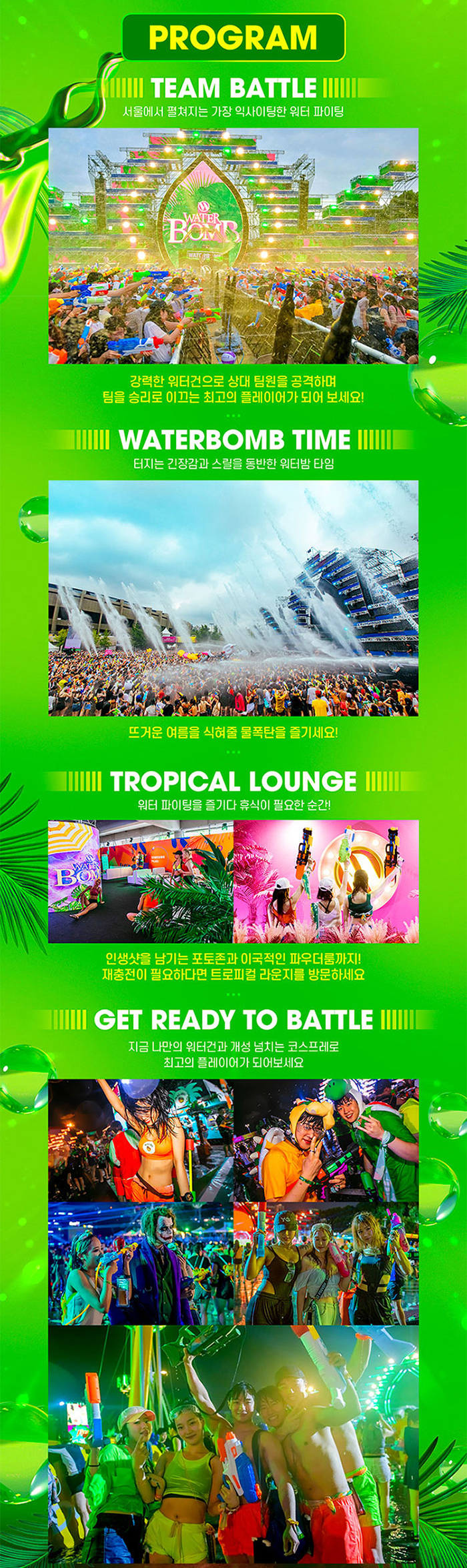 그리고 워터밤 행상의 또 빠지면 아쉬운 Team Battle, Waterbomb Time, Get Ready to Battle과 같은 프로그램들이 있습니다. #Team Battle 은 강력한 워터건으로 상대팀을 공격하여 팀을 승리로 이끄는 것으로 가장 익사이팅한 워터 파이팅을 즐길 수 있는 시간입니다. 그리고 #Waterbomb Time 은 바로! 터지는 긴장감과 스릴을 동반한 뜨거운 여름을 식혀줄 물폭탄 타임입니다. 그리고 여러분의 워터건과 개성 넘치는 코스프레로 최고의 플레이어가 되어볼 수 있는 #Get Ready to Battle 도 있답니다!