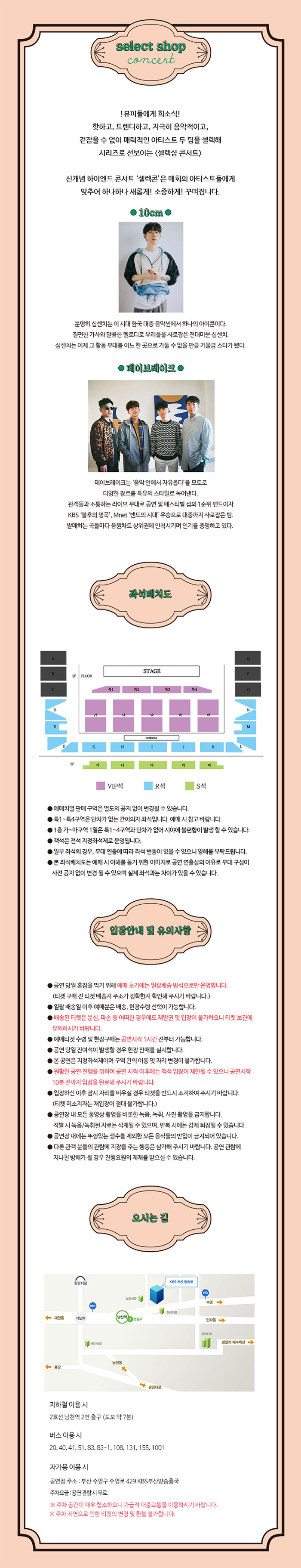 핫하고, 트렌디하고, 지극히 음악적이고, 걷잡을 수 없이 매력적인 아티스트 두 팀을 셀렉해 시리즈로 선보이는 #셀렉샵콘서트! 신개념 하이엔드 콘서트 '셀렉콘'은 매회의 아티스트들에게 맞추어 하나하나 새롭게! 소중하게! 꾸며집니다. 이번에 셀렉된 아티스트는 달콤한 목소리와 멜로디로 여심을 사로잡는 혼자하는 1인 인디밴드 #십센치 와 화려한 퍼포먼스로 완성형 밴드라는 수식어를 얻은 #데이브레이크 입니다!