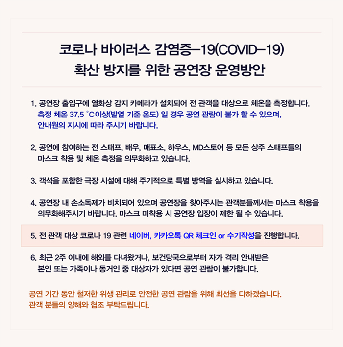 *"생활 속 거리두기" 지침에 따라 좌석간 거리두기 및 방역 수칙을 철저히 지키며 공연을 준비하고 있습니다.