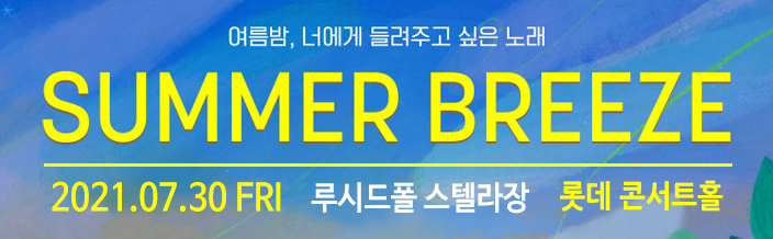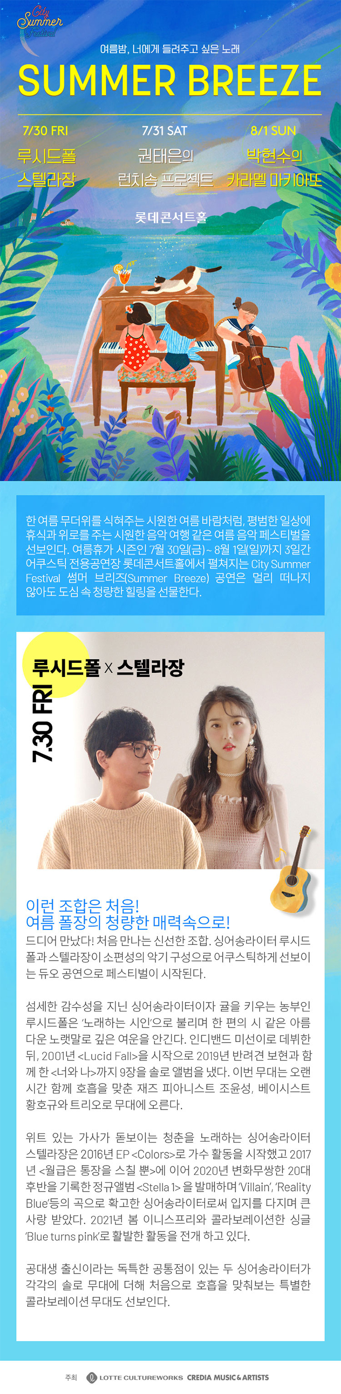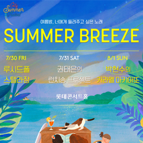 한 여름 무더위를 식혀주는 여름 바람처럼, 평범한 일상에 휴식과 위로를 주는 시원한 음악 여행 같은 여름 음악 페스티벌을 선보입니다. 여름휴가 시즌인 7월 30일(금) ~ 8월 1일(일)까지 3일간 어쿠스틱 전용공연장 롯데콘서트홀에서 펼쳐지는 City Summer Festival 썸머 브리즈(Summer Breeze) 공연은 멀리 떠나지 않아도 도심 속 청량한 힐링을 선물합니다.