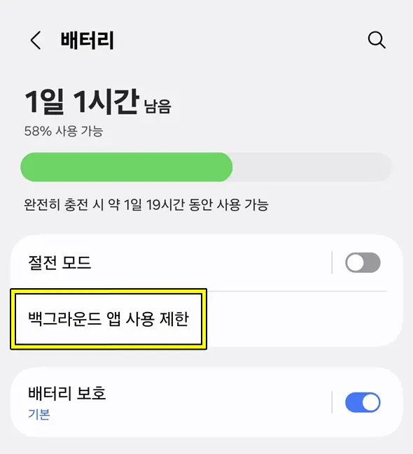 3) [배터리] 페이지에서 [백그라운드 앱 사용 제한]을 클릭합니다.