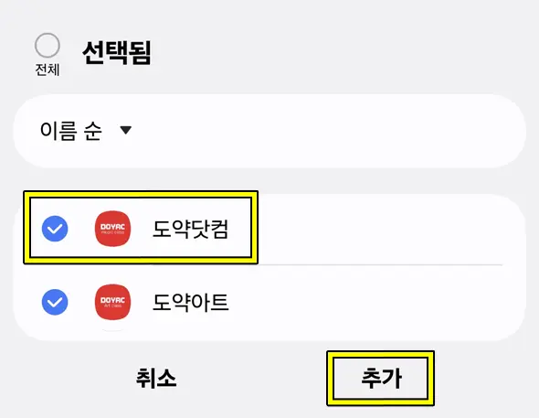 5) 오른쪽 위에 '+' 버튼을 눌러 [도약닷컴]을 찾아 체크하고, 하단의 [추가] 버튼까지 눌러주세요.