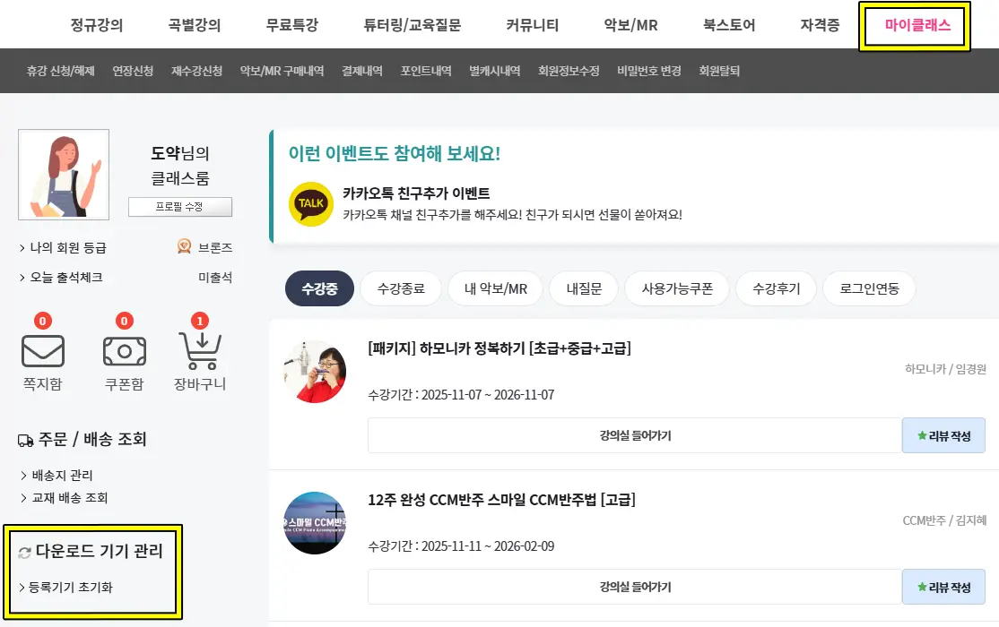 [마이클래스] 클릭 → 왼쪽 하단의 [다운로드 기기관리 - 등록 기기 초기화] 버튼 클릭 → 원하는 강의의 [등록 기기 초기화] 버튼 클릭!