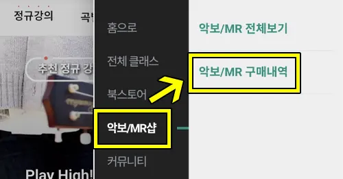 2. 그 다음 [악보/MR샵] > [악보/MR 구매내역]을 클릭하면 확인하실 수 있습니다.