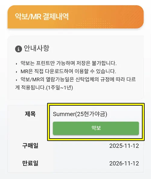 악보/MR만 개별적으로 구매하신 경우 아래의 방법으로 확인하실 수 있습니다. (PC/모바일 동일)