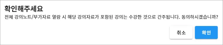 ※ '전체 강의노트/부가자료 열람 시 해당 강의자료가 포함된 강의는 수강한 것으로 간주됩니다. 동의하시겠습니까?'를 동의하시는 경우, 강의 교환 및 환불이 어려울 수 있음을 알려드립니다.