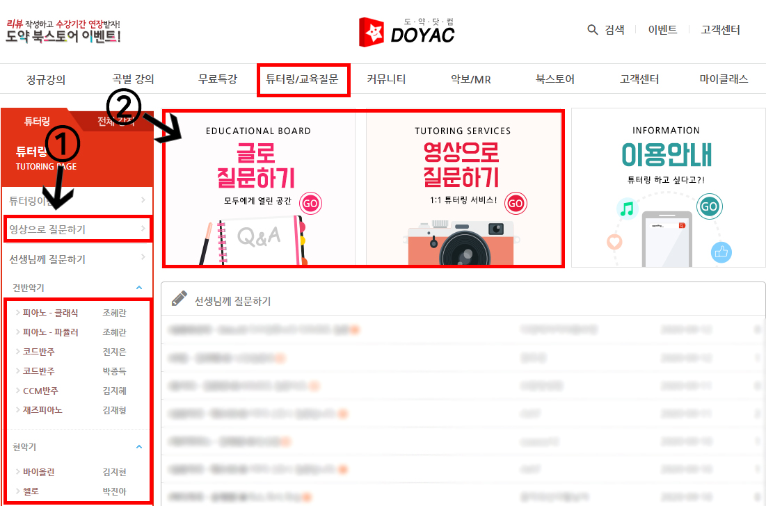 - 상단 메뉴 중 [튜터링/교육질문]을 클릭한 다음 ①번 또는 ②번 항목 중 원하시는 질문 유형을 선택하여 질문하실 수 있습니다.