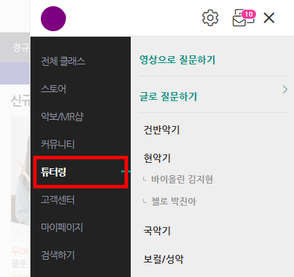 - 왼쪽 위에 세줄 아이콘을 클릭한 다음 [튜터링] 메뉴를 클릭하여 원하시는 유형을 선택하여 질문하실 수 있습니다.