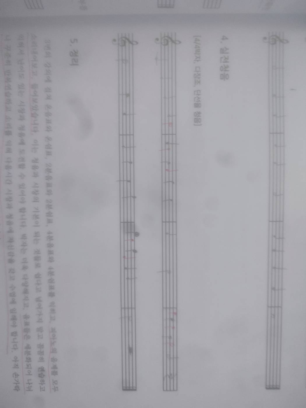 1.음정의 도약이 많은 경우 음을 잡기가 힘듭니다. 2\. 다이아토닉 스케일에 없는 음이 도약이 있으면 잡기가 어렵습니다. (예:과 3번째 마디 D-G-bB-D 등) 3\. (최대한 C를 생각하면서 맞춰보려고 노력합니다.) 빨간색은 음정은 청음시 틀린 음들을 고친겁니다.