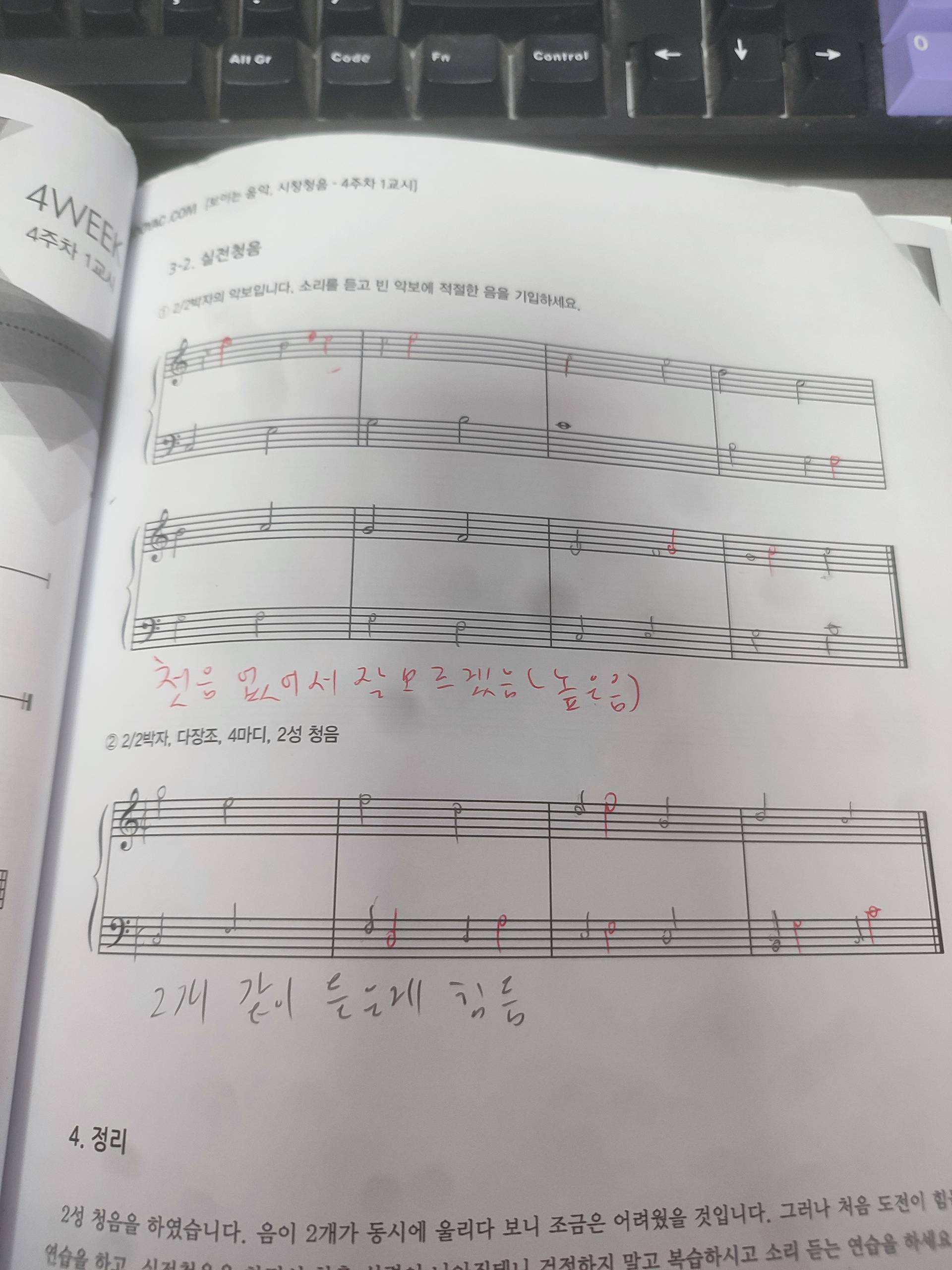 1\. 첫음 없이 할려고 하니 잘 모르겠습니다. 2\. 2개 성부 같이 듣는게 아직은 너무 버겁습니다. 과제. 다이어토닉 스케일 외 다른 음들이 나오면 원 조로 돌아 오는게 아직 버겁습니다.