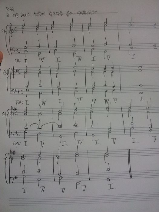 p,63 2번 다음베이스 선율에 상 3성을 붙여 4성화 하여라 강의 듣고 풀었는데 처음이라 ㅋㅋㅋ