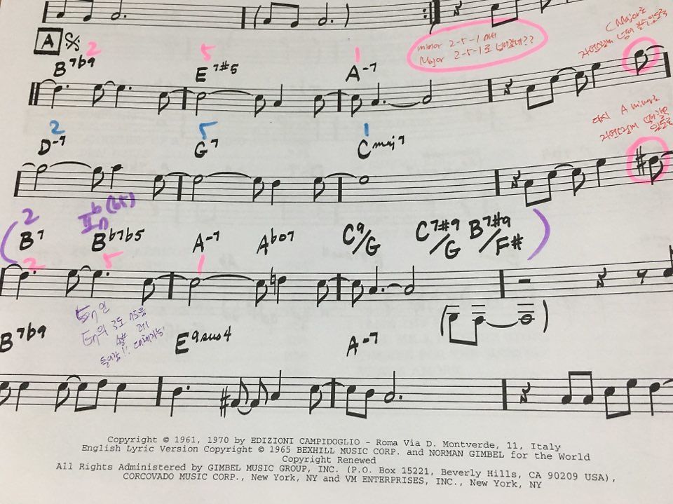 2. 3번째줄 보라색으로 괄호 친 코드 진행을 분석해볼려고했는데 B7 다음에 E7의 대체로 B플렛7