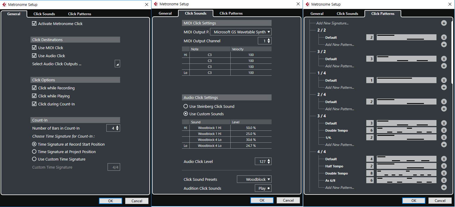 Metronome Setup -> Click Sound 에서 Midi Output 을 Microsoft GS Wavetable Synth , MIDI Output Channel 을 1로 둬야만 그나마 소리가 나는데요, 이것도 피아노 소리가 나고 있습니다.