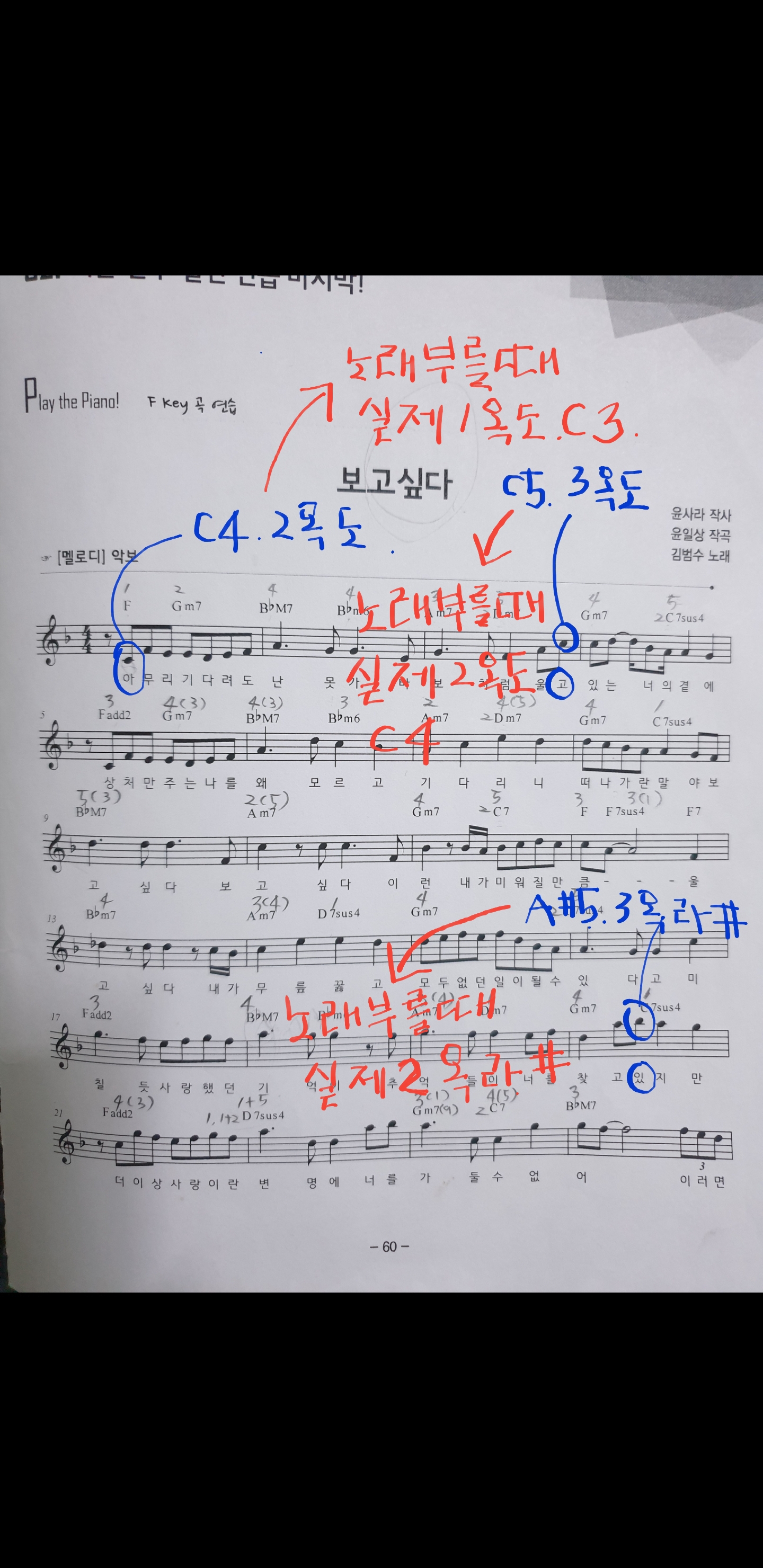 악보상에 보고싶다 도입부 아무리기다려도 에서 ,아 부분이 보컬기준 2옥도,C4로 표기되어있는데요 실제 노래부를땐 한옥타브낮은